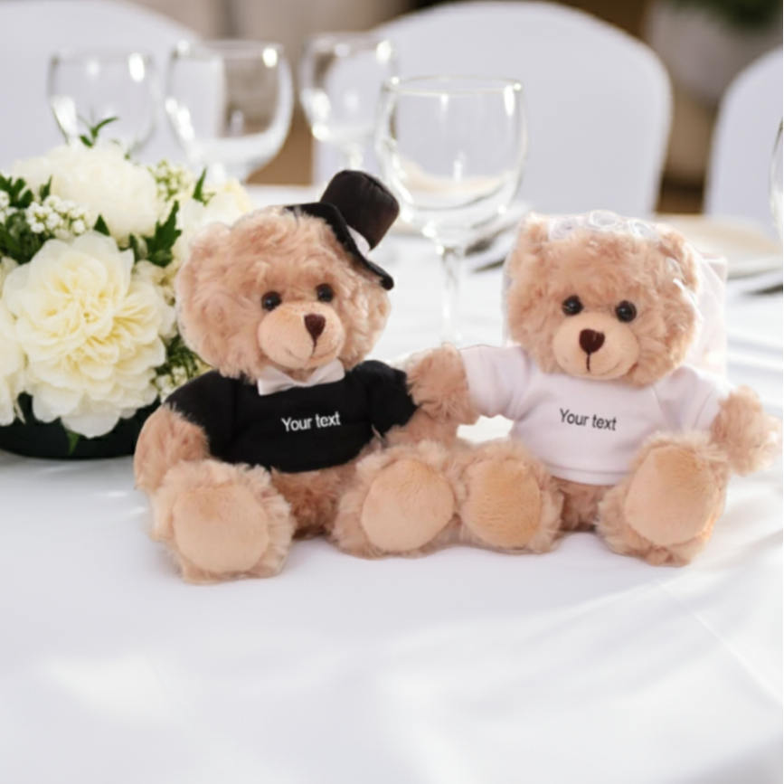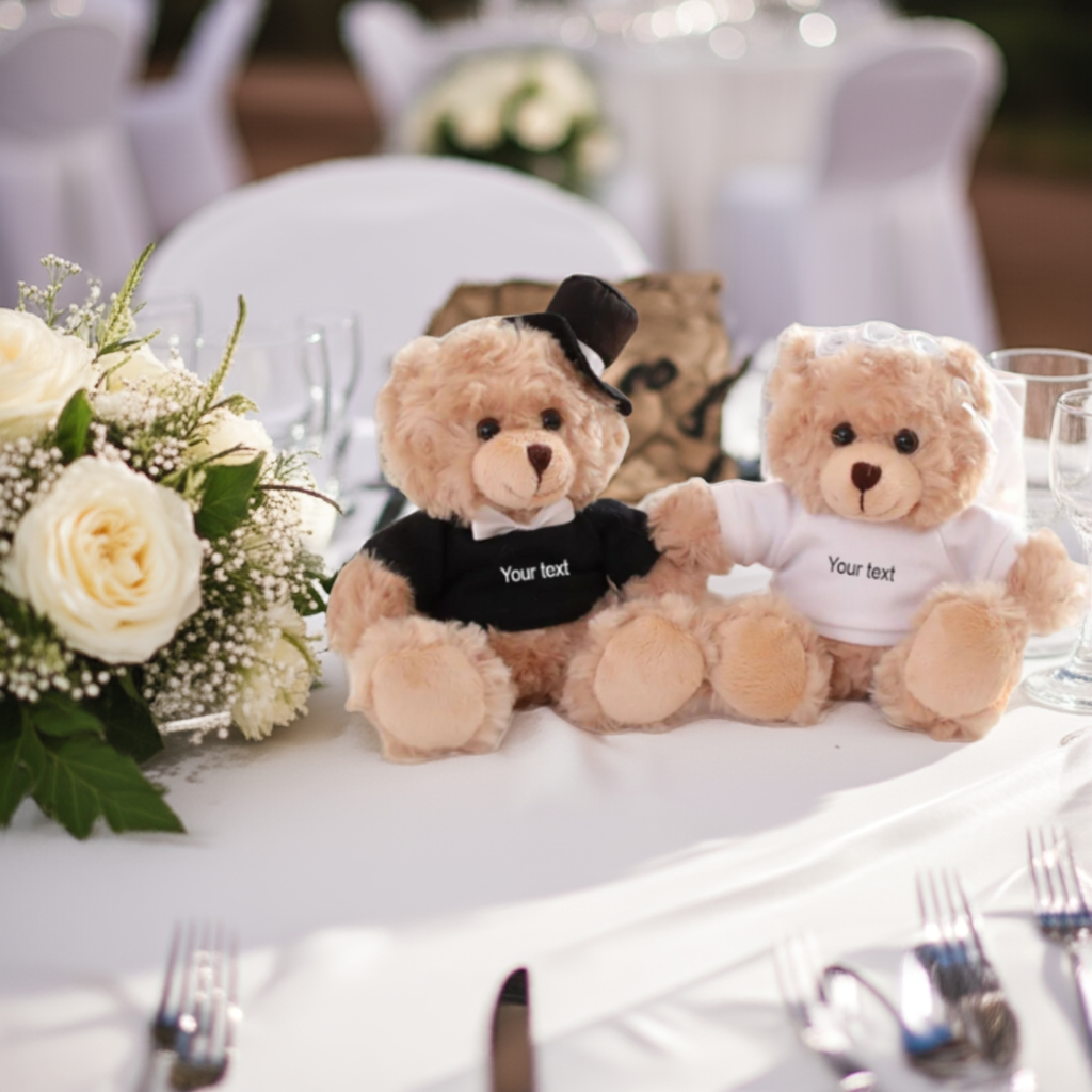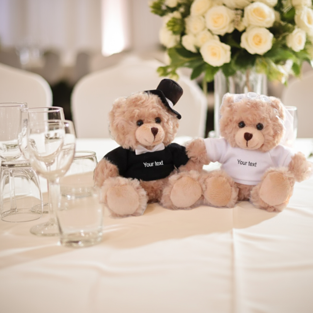 Celebrate love with these expertly crafted custom couple wedding bears. Each 6” plush bear can be personalized with your image, design, logo, or text, creating a truly unique keepsake. Perfect for commemorating weddings or special occasions, these charming stuffed animals make thoughtful gifts that will be treasured for years.