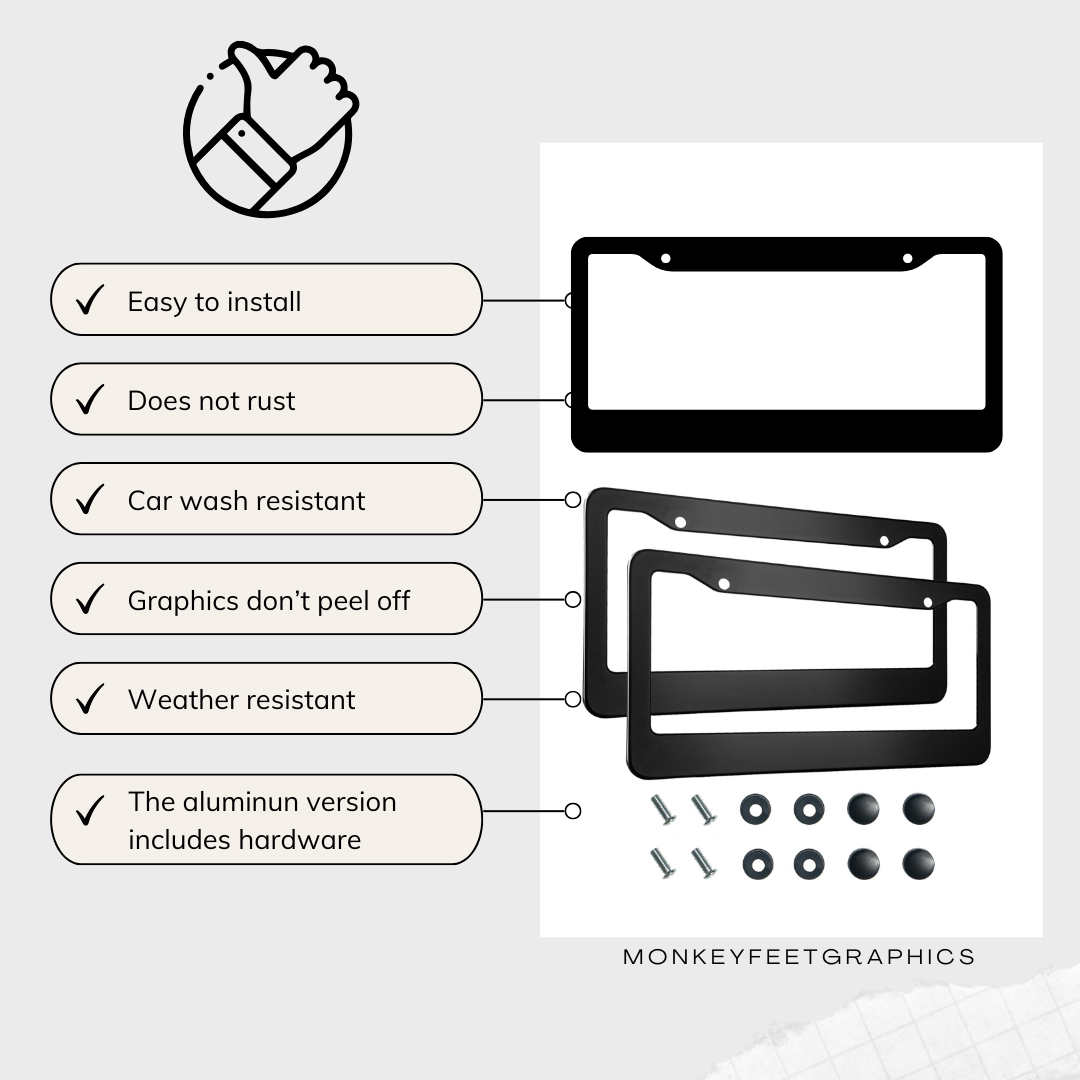 Sturdy license plate holder in black plastic or aluminum (your option) with graphics made of high-quality outdoor permanent vinyl (weather-resistant decal)